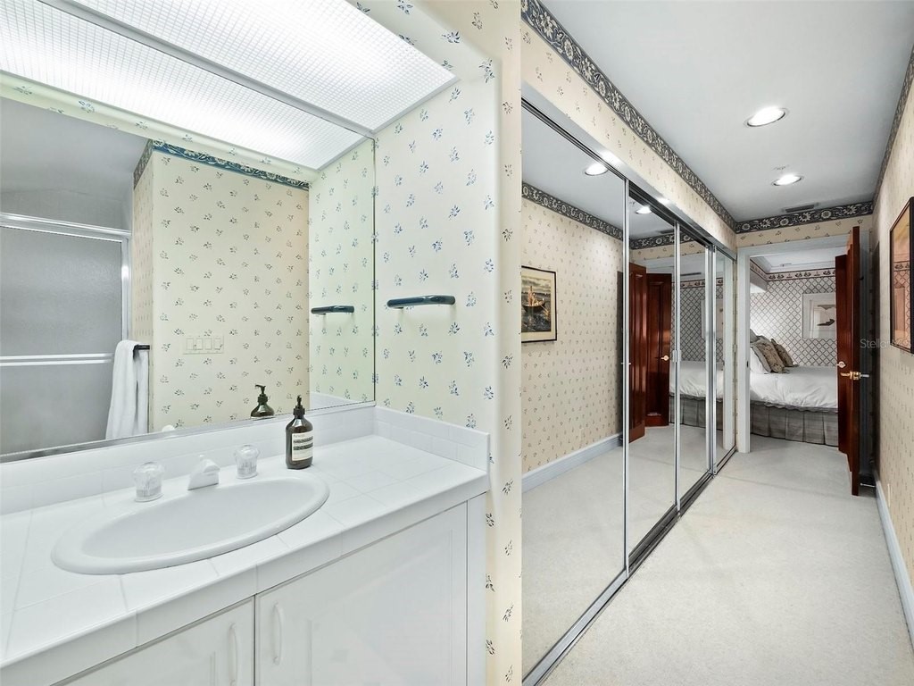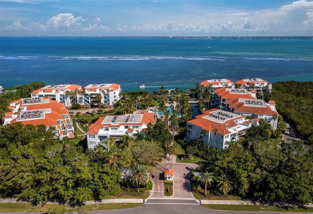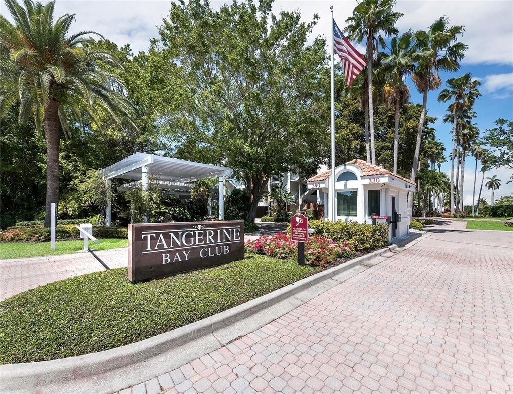 PENTHOUSE. Delight in scenic views of Sarasota Bay in this custom-designed, rare 4 bedroom, 4.5 bathroom in the gated resort-style Tangerine Bay community on the southernmost tip of Longboat Key. The residence is only minutes from St. Armand's Circle, across the street from the Longboat Key Club, and a short driving distance to the Bay Isles Beach Club and vibrant downtown Sarasota. Filled with abundant natural light, the spacious condominium features soaring ceilings, a great room with gas fireplace, marble foyer and gallery for displaying artwork, and private gated courtyard. All bedrooms are ensuite. New sliding glass doors in the primary suite and new glass window in the great room open to a tiled terrace where you can start your day with a cup of coffee while watching the sunrise over the lagoon and Bay. An additional west-facing terrace upstairs boats golf course and sunset views. The well-equipped kitchen includes stone counters, breakfast bar, large pantry and morning room. There is also a fully enclosed two-car garage with plenty of storage space as well as two AC units in the condominium. The Tangerine Bay Club community boasts beautifully manicured walking paths, amid newly planted tropical greenery as well as many amenities, including a pool with waterfalls, fitness center, a tennis/pickleball court, plus a day boat dock and fishing pier on the Bay. Residents have the option of joining the Beach Club (normally reserved for only Bay Isles residents) on the Gulf of America.